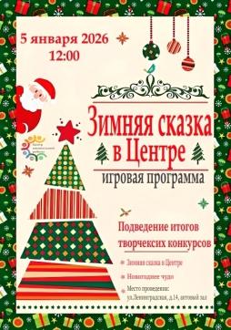 5 января 2026 года в 12:00 состоится игровая программа «Зимняя сказка в Центре». Вас ждут веселые игры, приятные сюрпризы и торжественное награждение победителей конкурсов «Новогоднее чудо» и «Зимняя сказка в Центре».